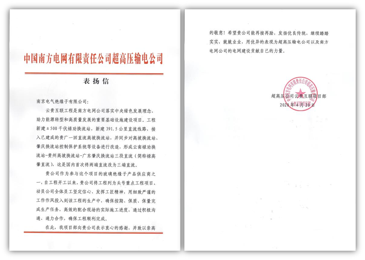 2020年4月20日,中國南方電網有限責任公司超高壓輸電公司云貴互聯項目部向南京電氣絕緣子有限公司致表揚信,對南京電氣按期保質保量完成生產供貨任務、高效配合現場施工給予表揚,并表示感謝。 表揚信說,...