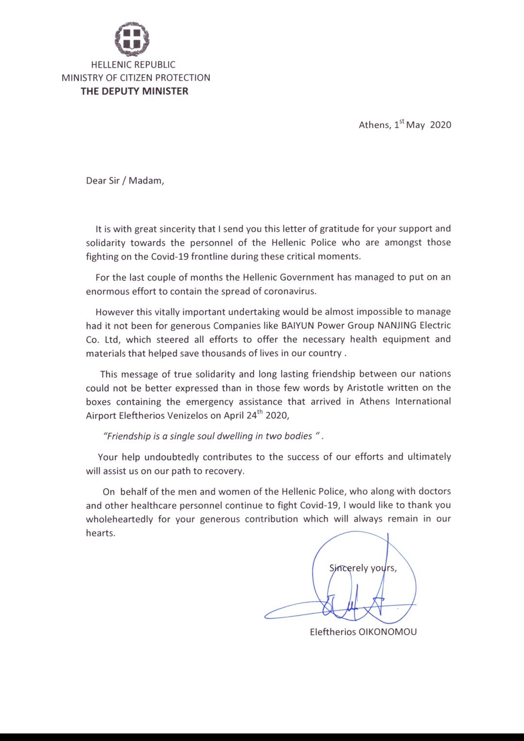 2020年5月1日,希臘共和國公民保護(hù)部副部長Eleftherios OIKONOMOU先生于雅典向南京電氣發(fā)出感謝信,對(duì)南京電氣在新冠肺炎疫情防控中對(duì)希臘安全與警察部門及時(shí)提供支持幫助表示感謝。 感謝信說,作為在抗擊...