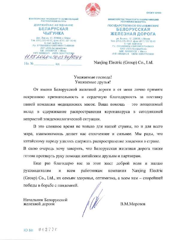 2020年5月11日,白俄羅斯鐵路長官弗拉基米爾•莫洛佐夫先生代表白俄羅斯鐵路部門,向南京電氣發(fā)出感謝信,對(duì)南京電氣向白俄羅斯鐵路局提供防疫物資支援表示感謝。 感謝信說,在當(dāng)今疫情防控特殊時(shí)期,...