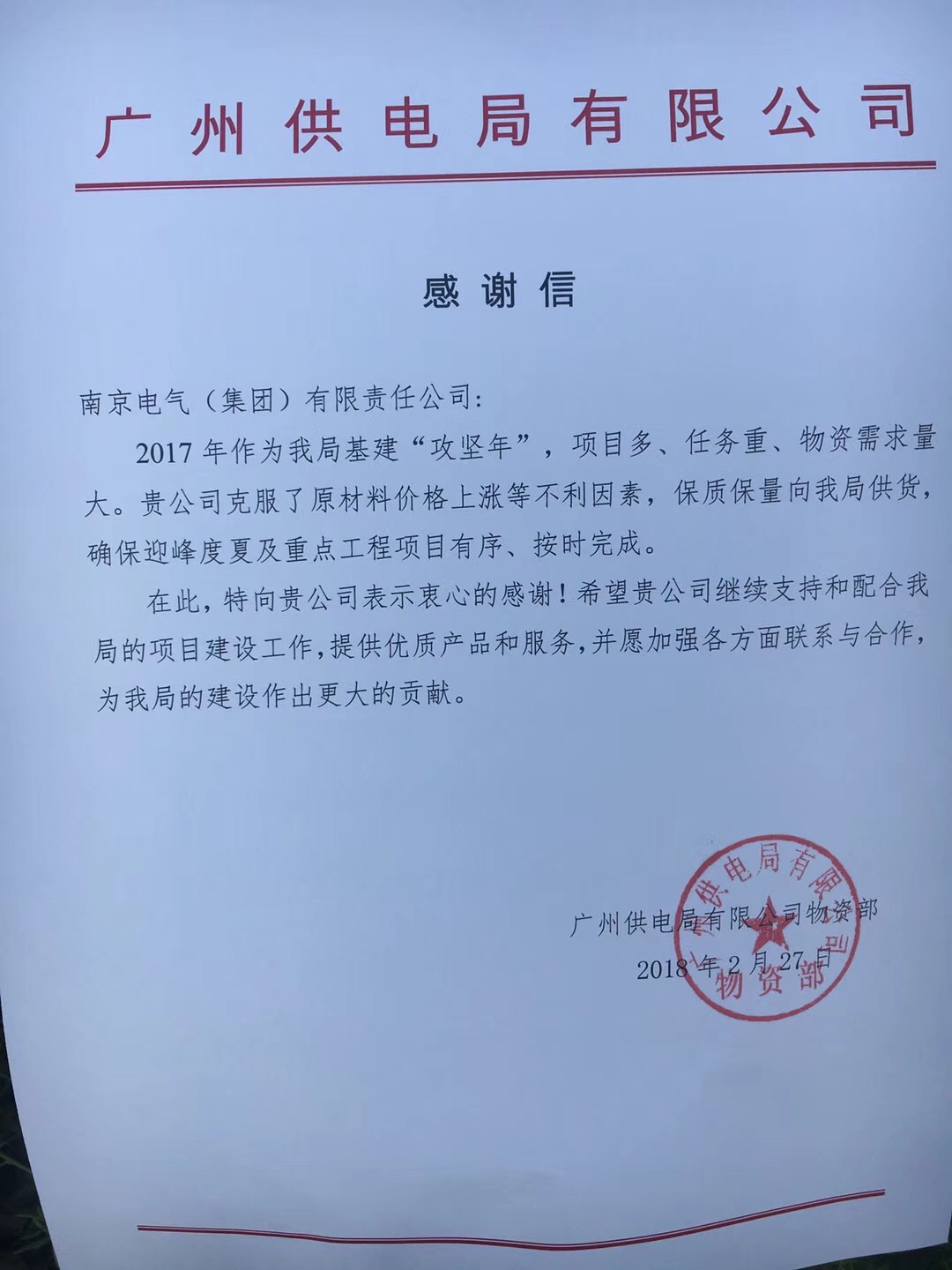 廣州供電局有限公司近日向南京電氣(集團)有限責任公司發來感謝信,對南京電氣去年保質保量向該局供貨、確保迎峰度夏及重點工程項目按時完成表示感謝。 感謝信說,2017年作為我局基建“攻堅年&...