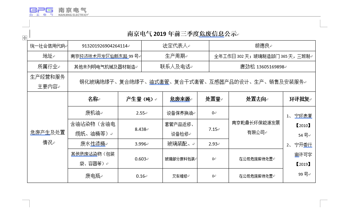 南京電氣2019年前三季度危廢信息公示